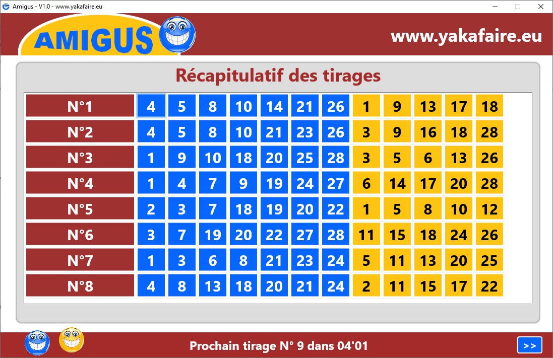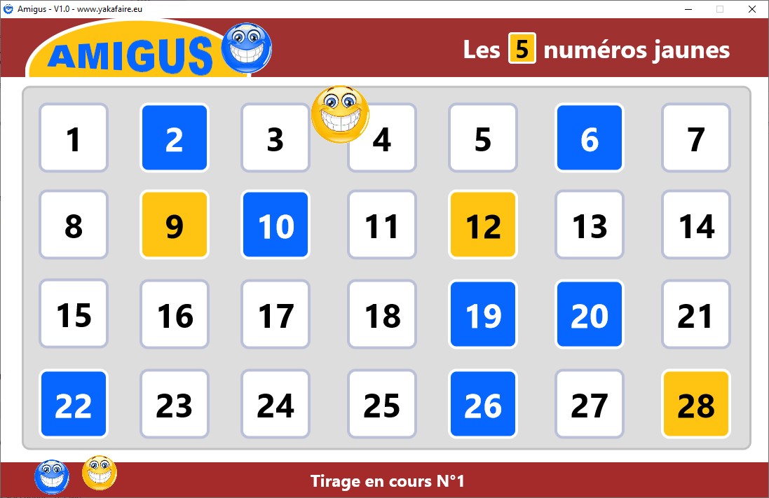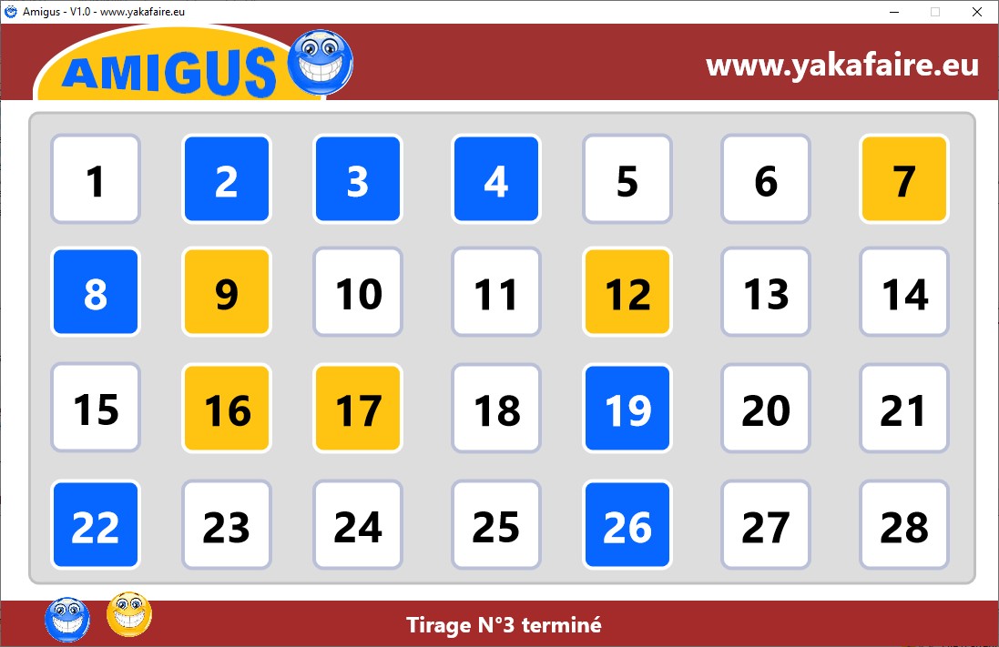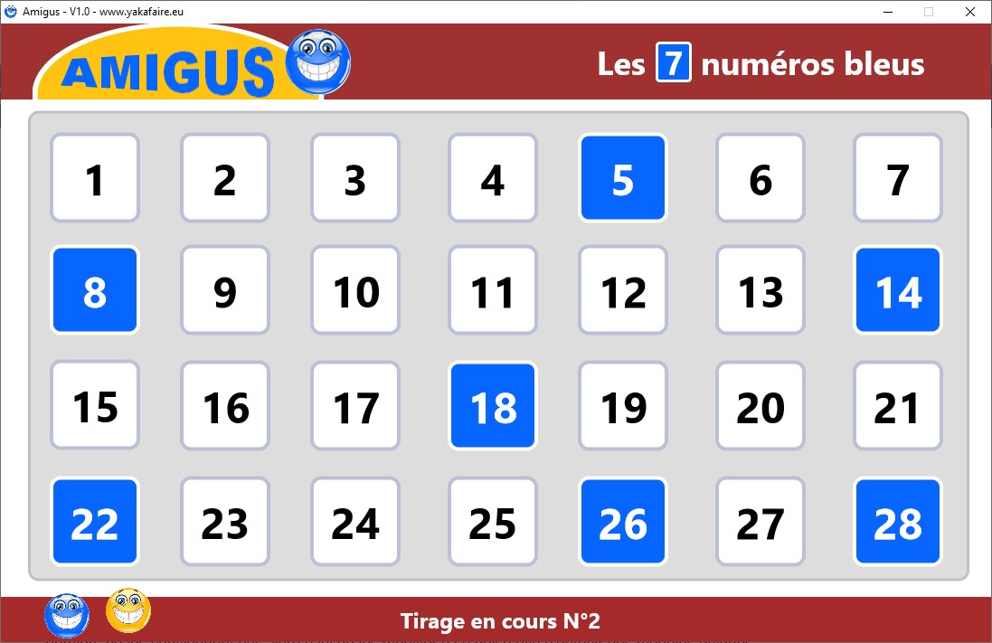 Amigus le clone Amigo de la FDJ est un logiciel gratuit permettant d'effectuer des tirages aléatoires. À chaque tirage, 12 numéros sont tirés au sort parmi les 28 numéros (7 numéros "bleus" et 5 numéros "jaunes"). Un tirage toutes les cinq minutes, un bouton vous permet de passer directement au tirage suivant. Entre deux tirages Amigus affiche le récapitulatif des tirages precedents.