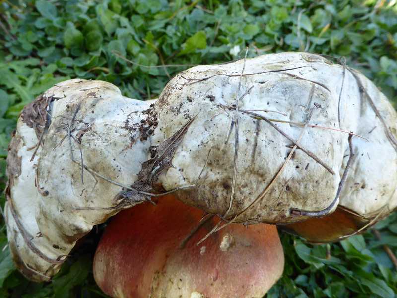 Blanc laiteux, puis légèrement ocracé sale, lisse parfois avec lambeaux de voile général. Hémisphérique charnu, à marge crémeuse [10-20 (30) cm]. |