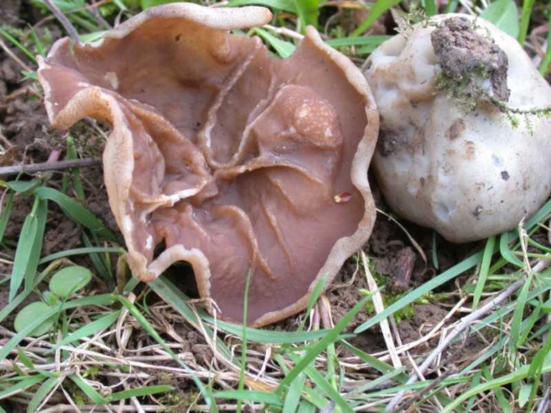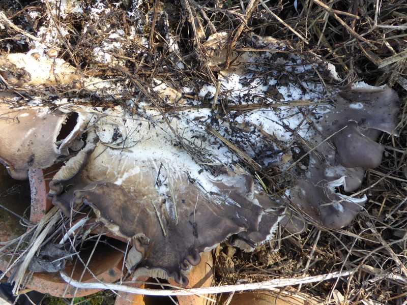 Squames ou écailles brunes à gris brunâtre étalées en étoile sur fond blanchâtre. Convexe à plat, marge enroulée au début (5 x 8 cm). |