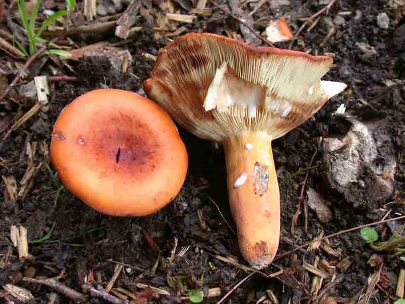 Orange vif, lisse, parfois avec lambeaux blancs, convexe, charnu (10-20 cm). |