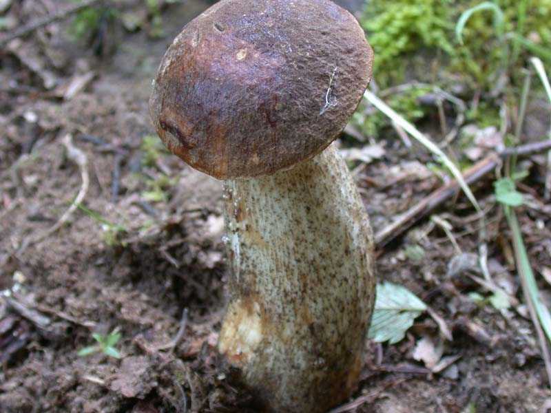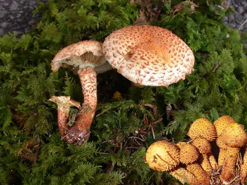 Couvert de squames gris sépia sombre sur fond crème. Conique, convexe, étalé mamelonné [5-8 (10) cm]. |