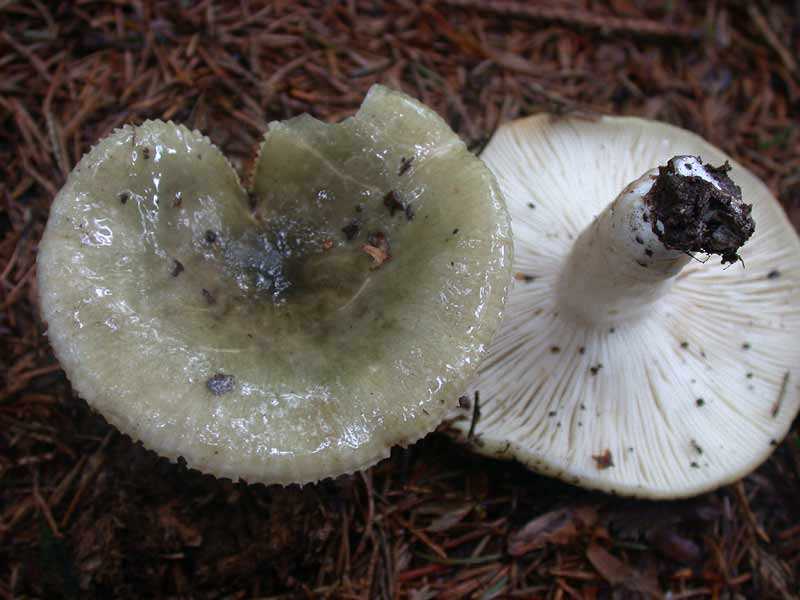 Blanc pur saturé (soyeux), légèrement visqueux. Convexe, conique puis étalé, plan mamelonné (5-10 cm). |