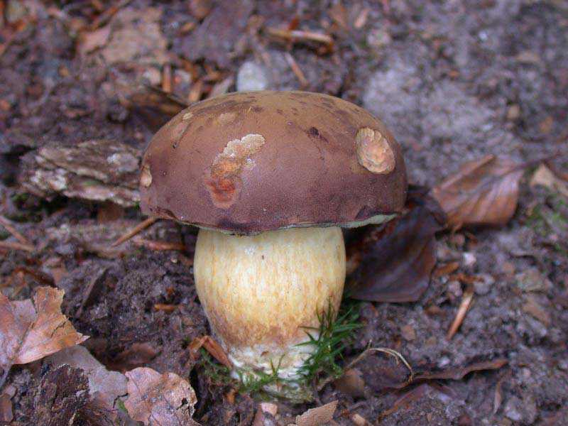Squames concentriques assez larges, brun noirâtre sur fond pâle, gris ocracée. Convexe, charnu (10-15 cm). |