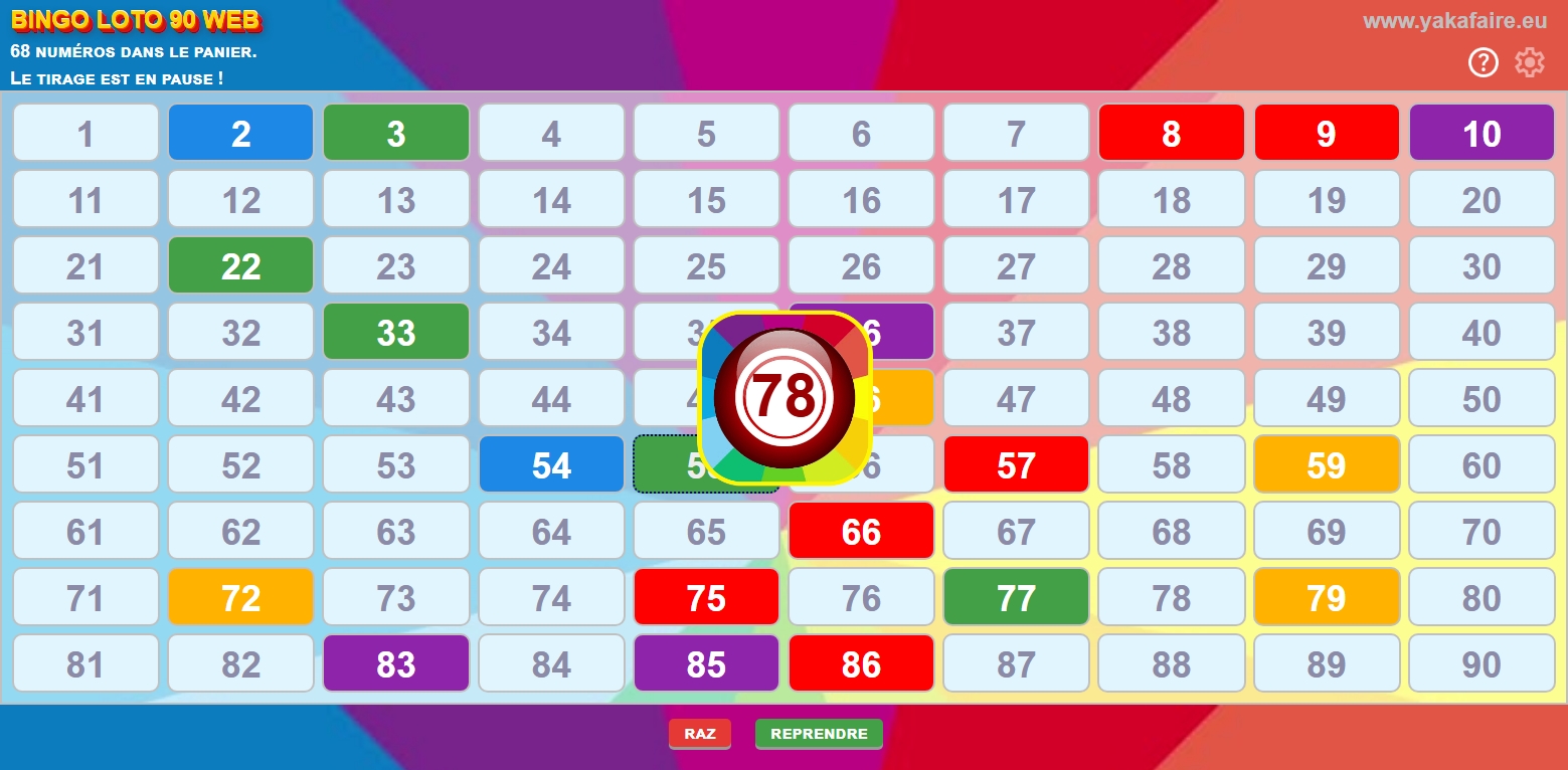 Bingo loto 90 web est un simulateur gratuit permettant d'effectuer des tirages de numéros aléatoires de 1 à 90. Organiser vos tirages de Bingo Loto pour les associations ou entre amis sur votre ordinateur, téléphone ou tablette. Aucune installation requise et c'est gratuit. Pour lancer l'application Bingo loto 90 WEB cliquer sur le bouton vert ci-dessous.