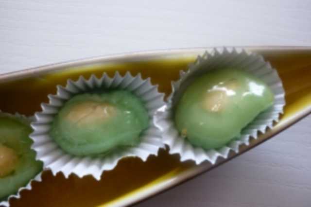 Façonnez la pâte d'amandes en boulettes en formant un creux au milieu. Placez une amande dans ce creux. Préparez un caramel en faisant fondre le sucre et l'eau jusqu'à la couleur désirée. Ajoutez le citron. Placez le caramel dans un bain-marie chaud pour qu'il reste liquide et trempez-y chaque boulette en utilisant une fourchette. Après durcissement du caramel, placez les boulettes dans des caissettes en papier.