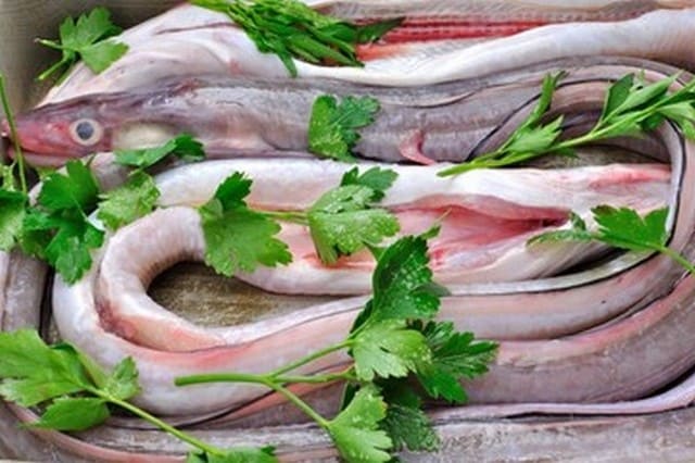 Préparez un court-bouillon au vin blanc et faites-y pocher 800 g d'anguilles pendant 15 mn. Egouttez le poisson, badigeonnez-le de moutarde, arrosez-le de beurre fondu et faites griller à four vif. Posez l'anguille sur le plat de service chauffé, garnissez de demi-rondelles de citron et de cornichons au vinaigre.