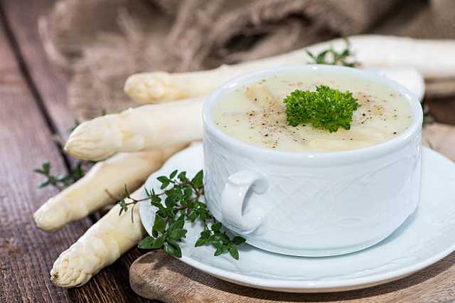 Pour 4 personnes. Préparation 20 mn. Cuisson 15 à 25 mn. 1,500 kg d'asperges. Sauce: 200 g de crème fraîche liquide fleurette, 4 jaunes d'oeufs, sel, poivre, ciboulette hachée à volonté .