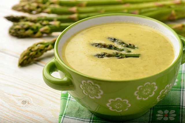 Pelez les asperges et cuisez-les. Lorsqu'elles sont cuites, égouttez-les et réservez quelques pointes. Passez le reste et les autres asperges au mixeur. Préparez une béchamel avec le beurre, la farine du sel, du poivre et une partie du lait. Ajoutez la purée d'asperges à cette béchamel. Etendez avec le reste du lait. Remettez sur feu doux. Ajoutez la crème, et servez en mettant dans chaque assiette 3 pointes d'asperges et quelques brins de cerfeuil. On peut rendre ce potage encore plus fin (et plus riche ) en ajoutant 1 ou 2 jaunes d'oeufs battus dans la soupière. Fouettez pour bien mélanger.