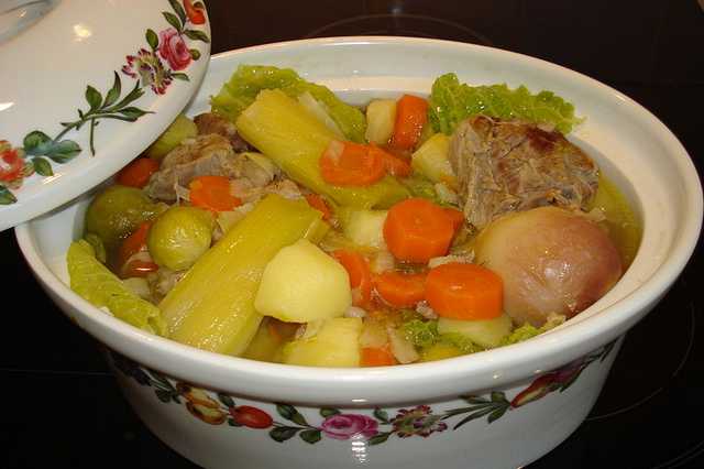Pour 6 à 8 personnes: 1 queue de boeuf, 1 kg de plates-côtes découvertes, 1 épaule de mouton désossée et ficelée, 2 oreilles de porc, 1 saucisson à cuire, 1 petit chou, 1 pied de céleri en branches, 1 livre de carottes, 4 navets, 4 poireaux, 2 gros oignons, 2 gousses d'ail, 300 g de gros haricots verts, 8 pommes de terre, sel, poivre en grains, clous de girofle, baies de genièvre, gruyère râpé.