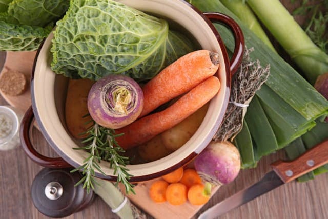 Pour 10 personnes: Du jarret de boeuf, du plat de côte, 1 jarret de porc demi-salé, 1 chou, 6 carottes, 4 navets, 6 pommes de terre, 6 poireaux, 500 g de farine de sarrasin, 100 g de beurre, 1 verre de lait, du bouillon, une quinzaine de pruneaux trempés dans de l'armagnac,; 3 clous de girofle, des graines de coriandre, 1 bouquet garni ( persil, thym, 2 feuilles de laurier), 4 c à soupe de crème fraîche, du céleri, 1 oignon, 2 oeufs.