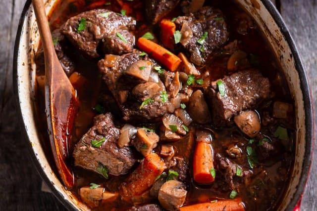 Pour 4 personnes. Préparation: 30 mn. Cuisson: 2 h 45. 1,2 kg de boeuf à braiser (jumeau ou macreuse), 150 g de poitrine fumée, 2 carottes, 1 gros oignon, 1 gousse d'ail, 200 g de petits oignons blancs, 1/2 bouteille de vin rouge de Bourgogne, 2 cuillerées à soupe d'huile, 1 tablette de bouillon de boeuf, 3 brins de persil, sel, poivre.