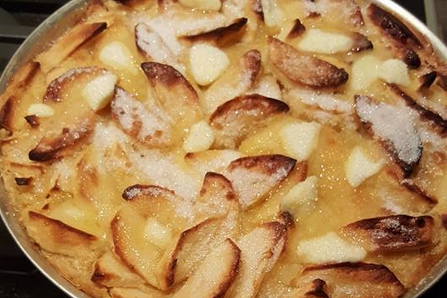 Mettre les pommes dans un plat à feu, rond. Couvrir avec la pâte à crêpe. Cuire au four en beurrant le dessus dès que la pâte est prise. Quand le tout est cuit, saupoudrer de sucre la surface. Faire colorer. Couronner avec la confiture d'abricots passée ou tamisée.