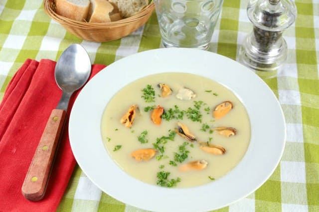 750 g de moules, thym, laurier, 1 jus de citron, 1 bon morceau de beurre, 1 jaune d'oeuf, 1 poignée d'oseille hachée et revenue au beurre, Crème fraiche ou lait. Cuisson: 10 minutes environ.