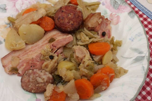 1 kg de bœuf (plates côtes ou paleron), 500 g de lard demi-sel, 1 saucisson fumé, 2 poireaux, 2 carottes, 1 navet, une rutabaga ou chou-navet, 1 gros chou blanchi, 1 bouquet garni, 1 oignon piqué de clous de girofle. Cuisson: 4 heures.