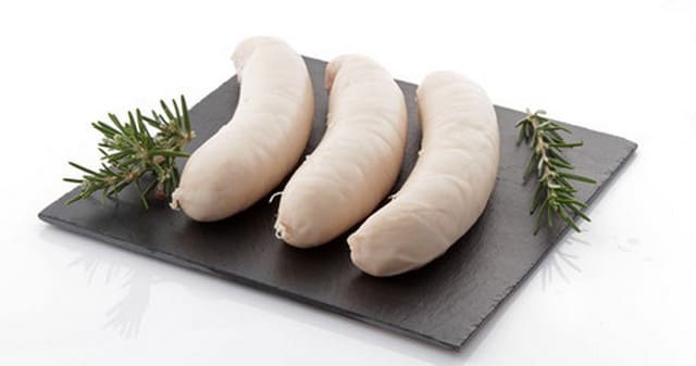 (Consommé plus particulièrement au moment de Noël) 150 g de panne de porc, 1 beau blanc de poulet rôti, 150 g de mie de pain, 2 œufs battus, 3 oignons, 1 clou de girofle, 1 branche de cerfeuil, 1.12 litre de lait, boyaux. Cuisson: 3/4 d'heure.