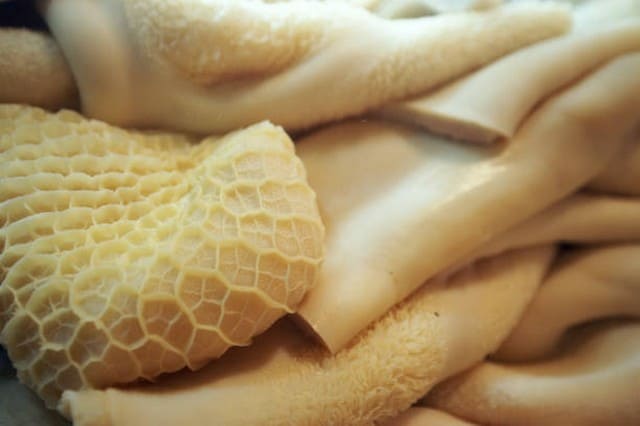 2 kg de tripes coupées en petits Ms, 5 ou 6 belles carottes, 15 échalotes hachées, 25 pruneaux, 1 petite branche de thym, 1 clou de girofle, bouillon, 1 bon verre de cognac, 1 morceau de beurre frais salé. Cuisson: 2 heures 1/2.