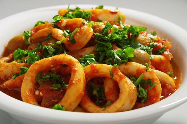 Nettoyez une douzaine de calmars et émincez-les (vous pouvez aussi utiliser des calmars surgelés). Faites-les blanchir 5 mn à l'eau bouillante salée, égouttez-les. Faites revenir à l'huile 2 oignons émincés, ajoutez les calmars 3 ou 4 tomates pelées et épépinées, et 2 poivrons nettoyés et coupés en lamelles. Mouillez de 2 dl de vin blanc sec, assaisonnez (sel, poivre, Cayenne). Couvrez et laissez mijoter pendant 45 mn. Saupoudrez de persil haché pour servir. Vous pouvez ajouter une poignée d'olives blanchies 10 mn avant la fin de la cuisson.