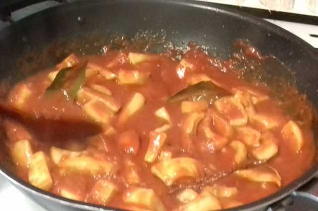 Faites revenir à l'huile dans une grande cocotte vos calmars. Lorsqu'ils sont bien saisis et un peu dorés réservez-les. Dans la même huile faites sauter 500 grammes d'oignons hachés; une fois dorés ajoutez une petite boîte de purée de tomate, un petit verre de cognac, un morceau de sucre, une cuillerée de paprika doux, du poivre de Cayenne. Remettez les calmars dans la cocotte et laissez mijoter 2 heures à feu très doux. La sauce doit être réduite et très épaisse.