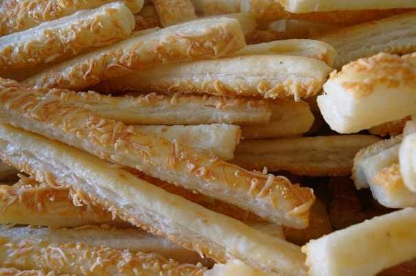 Faire une pâte feuilletée et ajouter lors des deux derniers tours du parmesan râpé, avant de plier. Etaler le feuilletage en bandes larges de 8 cm et épaisses d'1/2 cm. Détailler cette pâte en rectangles de la largeur d'un doigt. Dorer à l'oeuf. Parsemer à nouveau de parmesan et d'un peu de poivre de Cayenne. Poser sur une plaque à four et cuire à four très chaud 7 mn. Servir tout de suite avec l'apéritif ou avec les hors d'oeuvre.