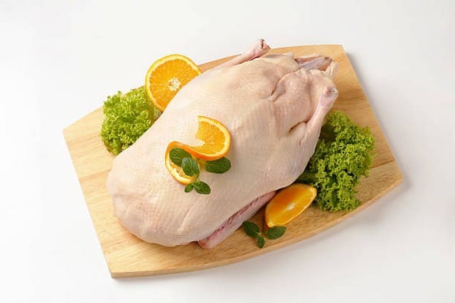 Un canard, 150 g de lard gras, 700 g de boeuf maigre, un os à moelle, une feuille de laurier, 3 clous de girofle, un coeur de chou, 3 oignons, 3 blancs de poireaux, 2 branches de céleri, une gousse d'ail, 3 petites betteraves rouges cuites, 2 cuillerées à soupe de vinaigre, une grosse pincée de sucre, 1 dl de yaourt.