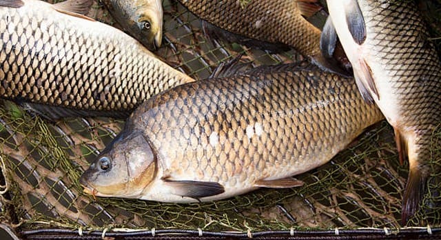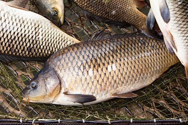 1/2 kg de carpe, 4 à 5 champignons émincés, 2 oignons, 1 piment, 2 pousses de bambou, 200 g de germes de soja, 1 c à café de sel, 4 c à soupe de sucre, 1/2 verre de vinaigre doux, 2 c à café de sauce soja, 1 verre de vin blanc sec, farine, huile.