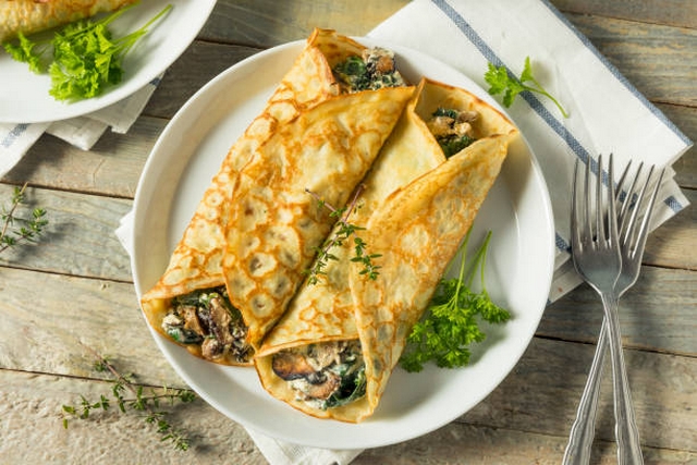 Préparez la pâte à crêpes avec les ingrédients indiqués. Laissez reposer 2 h. Pendant ce temps, faites la sauce: faites un roux blond avec le beurre et la farine mouillez de lait, assaisonnez, faites épaissir sur feu doux en remuant. Ajoutez le gruyère. D'autre part faites revenir les échalotes et les champignons hachés dans le beurre. Quand les champignons ont rendu leur eau, mélangez à la béchamel, puis joignez le jambon haché menu. Confectionnez les crêpes grandes et fines. Tartinez-les avec la farce préparée et roulez-les. Arrosez de crème. Vous pouvez aussi réserver un peu de sauce béchamel préparée pour arroser les crêpes. Saupoudrez de fromage et faites gratiner.