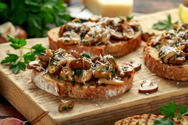 Faire fondre du beurre dans une poêle et faire dorer 150 grammes de champignons préalablement nettoyés et émincés, les réserver. D'autre part nettoyez 250 grammes de champignons, passez-les au mixer avec le citron. Mélangez ce hachis à l'oeuf battu avec la crème, joignez le persil haché, assaisonnez. Répartissez cette préparation sur les tranches de pain, ajoutez quelques champignons que vous avez réservé et passez à four chaud (180 °C) pendant 3 à 4 mn. Servez chaud ou froid.