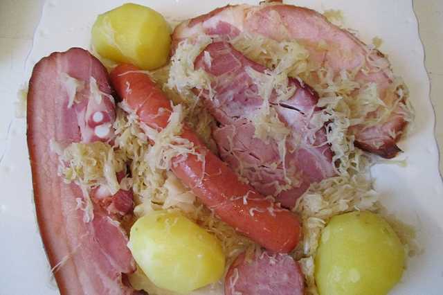 Garnissez une marmite ou un vaste poêlon en terre, de bardes de lard gras, mettez la moitié des oignons, les pommes et l'ail. Recouvrez d'une bonne couche de choucroute lavée et bien égouttée, ajoutez le morceau de petit salé. Poivrez généreusement, mais ne salez pas, parsemez de baies de genièvre et ajoutez ce qui reste de pommes, d'oignons et d'ail. Recouvrez avec le reste de la choucroute et mouillez avec tout juste assez de vin blanc pour couvrir la choucroute. Posez un couvercle sur le poêlon et faites cuire sur le feu ou au four à chaleur très douce (n° 1) de 4 a 6 heures. Plus la choucroute cuira, meilleure elle sera. Une bonne longe de porc, fumée ou fraîche, est excellente avec la choucroute. Mettez-la à cuire dans la choucroute environ 2 heures et demi avant de servir. Puis, une demi-heure avant le repas, ajoutez un bon saucisson à l'ail détaillé en rondelles et une collection d'autres saucisses. Au moment de servir, déposez le choucroute, en tas, au milieu d'un vaste plat de service, et disposez en garniture les tranches de viande, les rondelles de saucisson, les saucisses et les pommes de terre bouillies.