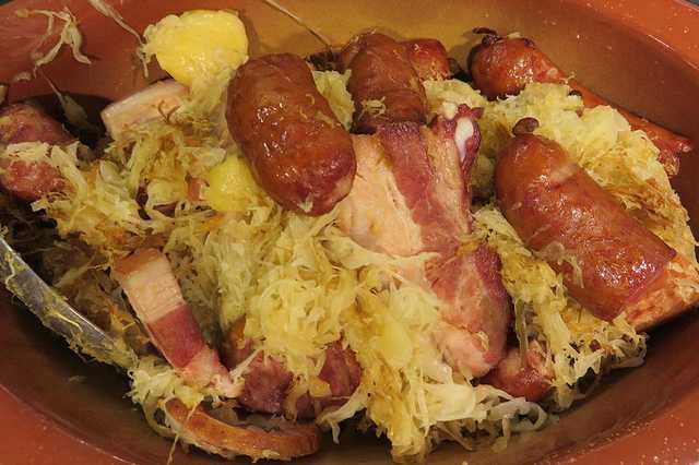 En Alsace, pour 6 personnes nous prévoyons 1,500 kg de choucroute. Après l'avoir lavée à grande eau, puis égouttée, nous en plaçons la moitié dans un fait-tout. Nous ajoutons alors 500 g de lard fumé et 500 g de palette ou de côtes de porc, que nous recouvrons avec le restant de la choucroute. Deux cuillerées de graisse d'oie sont adjointes ainsi que 2 gousses d'ail, une feuille de laurier, une douzaine de grains de genièvre, un oignon aux clous de girofle; le tout arrosé de 2 verres de Riesling. Nous recouvrons et laissons cuire à feu doux pendant 2 heures. Une heure après nous ajoutons 500 g de pommes de terre et, 10 minutes avant la fin de la cuisson, nos saucisses de Strasbourg.