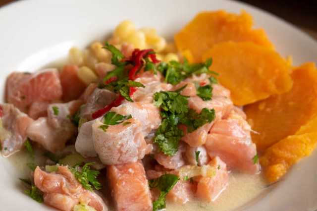 Videz le poisson, lavez-le, ôtez-en la peau; coupez la chair en dés et mettez-les dans une terrine, couvrez-les d'eau légèrement salée et laissez-les tremper pendant 1 h. Egouttez alors les dés de poisson, rincez-les, épongez-les avec du papier absorbant et placez-les dans un saladier. Pelez et émincez finement les oignons, séparez les anneaux; en procédant sous un filet d'eau courante, retirez les queues des piments frais coupez-les en deux, ôtez-en les graines et coupez-les en fines lanières; mettez le tout dans le saladier, ajoutez le piment en poudre, salez, poivrez et mélangez. Pressez les oranges et les citrons, arrosez le poisson avec les jus obtenus et laissez mariner pendant 3 h. 45 mn avant de passer à table, lavez les patates douces mettez-les dans une casserole d'eau froide, portez lentement à ébullition et laissez cuire à petits bouillons pendant 30 mn. Pendant ce temps débarrassez le maïs de feuilles et de ses barbes, coupez les épis en tronçons d'environ 3 cm; mettez-les dans une casserole d'eau froide; portez lentement à ébullition et laissez cuire à petits bouillons pendant 20 mn. Garnissez un plat creux avec les feuilles de salade et mettez le contenu du saladier au centre. Lorsque le maïs et les patates douces sont cuits, égouttez-les. Coupez les patates douces en tranches et disposez-les avec les tronçons de maïs autour du poisson. Si vous craignez la force des piments à laquelle les palais péruviens sont habitués, remplacez le piment frais par des poivrons rouges que vous passerez préalablement au four ou au gril pour pouvoir les éplucher; retirez ensuite les pédoncules et les graines intérieures coupez la chair en dés. Vous pouvez également diminuer la quantité de piment en poudre.