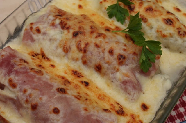 Pour 4 personnes: 1,5 kg d'endives, 8 tranches de jambon, 30 g de beurre, 30 g de farine, 50 g de crème, 1 verre de lait, 40 g de râpé, sel, poivre. Préparation: 30 mn. Cuisson : 1 h.