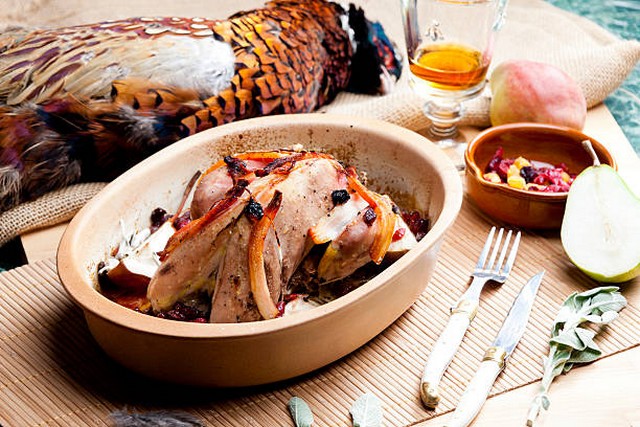 Pour 6 personnes: 1 faisan prêt à cuire, 150 g de lardons fumés, 200 de chou rouge, 150 g de petits champignons de Paris, 2 endives, 1 citron. Pour la cuisson: 10 cl de porto, 1 bouquet garni, 20 g de beurre, 3 c à soupe d'huile, sel, poivre. Pour la vinaigrette: 1 échalote, 1 c à soupe de vinaigre, 1 c à soupe d'huile de noix, 1 c à soupe d'huile, sel, poivre.