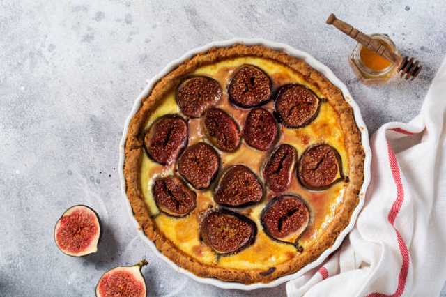 Foncez un moule à tarte de pâte brisée. Faites-le cuire à blanc 10 mn. Battez 3 oeufs entiers avec 75 g de sucre en poudre, 1 dl de crème fraîche et 75 g d'amandes en poudre. Versez cette crème sur le fond de tarte. Garnissez ensuite d'une dizaine de figues lavées, séchées et coupées en deux, que vous enfoncerez dans la crème (côté coupé au-dessus). Faites cuire à four chaud (220°C) pendant 30 mn.