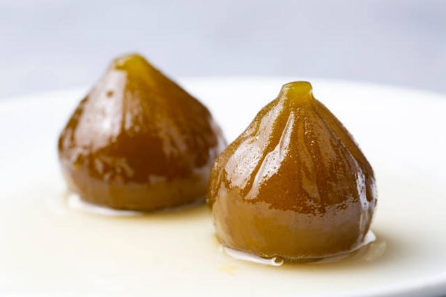 Faites un ou deux petits trous dans les figues pour que la vapeur puisse s'échapper lors de la cuisson. Mettez-les dans une petite casserole et versez le sirop sur celles-ci. Portez-les au four à température modérée pendant 40 minutes environ, jusqu'à ce que les fruits deviennent tendres. Arrosez plusieurs fois avec le sirop durant la cuisson. Mélangez le jus d'orange, les clous de girofle ainsi que la cannelle. Versez sur les figues chaudes et mélangez avec le sirop. Laissez refroidir. Puisque dans nos régions nous n'avons pas de figuiers dans les jardins, vous pouvez utiliser des figues séchées. Pour cela, couvrez-les d'eau chaude et laissez-les pendant 5 à 6 heures, jusqu'à ce qu'elles soient gonflées.