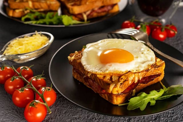 Préparation: 10 mn. Cuisson: 10 mn. Pour 4 personnes: 8 tranches de pain de mie de 15 cm de côté (ou 16 tranches de 10 cm de côté), 200 g d'emmenthal, 4 oeufs, 4 tranches de jambon 50 g de beurre.