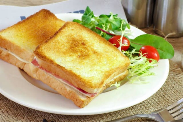 Choisissez du pain de mie que vous préférerez légèrement rassis. Coupez deux tranches par personne. Tartinez le pain avec du beurre manie avec une cuillerée de moutarde et du persil finement haché; posez une lamelle très fine de gruyère, couvrez avec de fines rondelles de tomate, une tranche fine de jambon de Bayonne. Terminez par une tranche de gruyère, assaisonnez de poivre et de muscade râpée. Posez un cube de beurre, faites cuire à four doux 10 minutes, laissez gratiner 5 minutes à four vif. Servez très chaud et croustillant.
