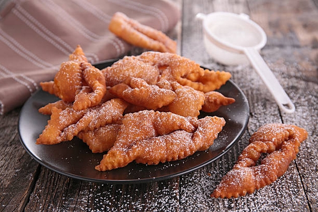 Pour 6 personnes: 500 g de farine, 6 oeufs, 100 g de sucre en poudre, 1 pincée de sel, 100 g de beurre, 1/2 verre de lait, 1 orange, 1 citron, sucre glace.