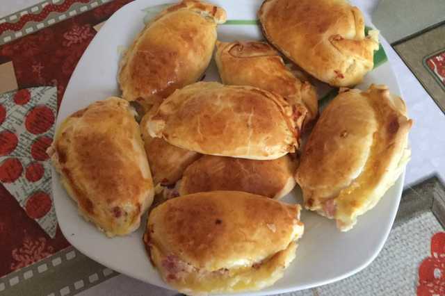 Mélangez bien 2 petits suisses de 60 g, 125 g de farine, 60 g de beurre, sel. Abaissez au rouleau à 1/2 cm de haut. Coupez en rondelles avec les bords d'un verre; posez sur chacune un morceau de jambon ou de langue écarlate (2 tranches) et une lamelle de gruyère, assaisonnez de Cayenne. Fermez comme un chausson, badigeonnez de jaune d'oeuf dilué. Mettez sur une plaque beurrée 30 mn à four modéré.