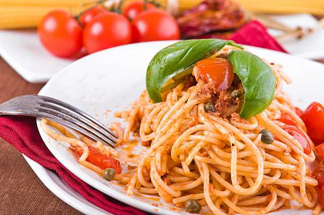 Faites revenir à l'huile d'olive 2 gousses d'ail hachées, ajoutez 500 g de tomates pelées (en boîte) et concassées, du sel, du poivre. Laissez cuire une douzaine de minutes, puis joignez 150 g de miettes de thon à l'huile et 2 c à soupe de câpres. Laissez mijoter 5 mn, joignez 1 c à soupe de persil haché. D'autre part, faites cuire 400 g de spaghetti à l'eau bouillante salée en les gardant fermes. Egouttez-les et servez-les avec la sauce préparée, sans fromage.