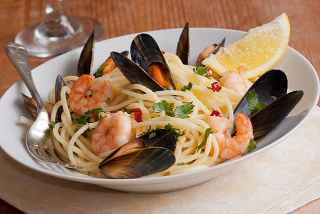 Pour 5 personnes. Préparation: 20 minutes. Cuisson: 25 minutes. 200 g de spaghettis, 2 litres de moules, 2 poignées de crevettes, 2 oignons, 1 gousse d'ail, sel, curry, poivre, farine, huile d'olive, thym, laurier, persil.