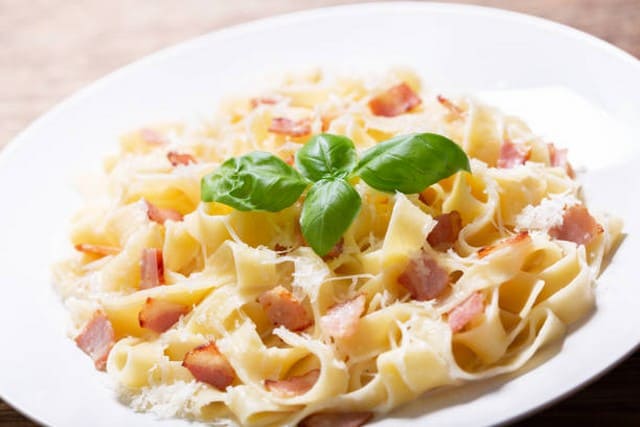 Préparation et cuisson: 30 minutes. 300 g de tagliatelles larges, 200 g de lard de poitrine fumé maigre, 30 g de beurre, 200 g de crème fraîche, ciboulette, sel, poivre, 1 feuille de laurier.