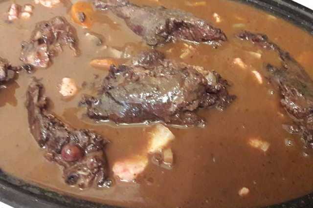 Pour 6 personnes: un lièvre de 2,5 kg environ, 2 verres à liqueur de cognac, 1 dl d'huile, du thym, du laurier, 2 branches de céleri, 3 carottes, 2 gros oignons, 250 g de lard, une trentaine de petits oignons, farine, 2 bouteilles de bon vin rouge, du poivre en grains, 8 croûtons frits au beurre, 30 g de saindoux.