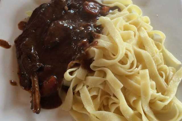 Faites mariner le lièvre pendant 24 heures dans 1/2 litre de vin avec l'eau-de-vie, 1 oignon en rondelles, 1 pointe d'ail, bouquet garni, clous de girolle, échalotes, sel et poivre en grains, Couvrez et retournez les morceaux de temps à autre dans la marinade. Dans une cocotte beurrée et huilée, faites dorer 2 oignons à feu vif, ainsi que le lard coupé en dés. Réservez-les. Epongez le lièvre, faites-le dorer à feu vif, saupoudrez de farine, laissez blondir. Ajoutez la marinade passée au tamis ainsi que le reste du vin, 1 bouquet garni. Couvrez et laissez mijoter pendant 2 heures. Fanes revenir à la poêle beurrée les champignons préalablement bien nettoyés, ainsi que les petits oignons saupoudrés de sucre. Ajoutez-les au civet en fin da cuisson. Servez avec accompagnement de petits croûtons de pain de campagne dorés au beurre et de pâtes.