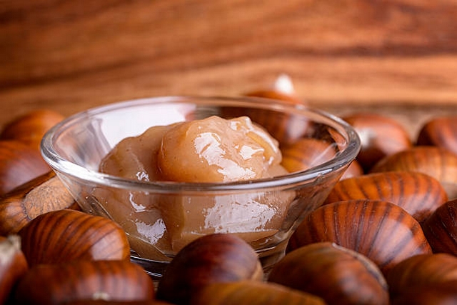 Faites une incision dans la peau de 1 kg de châtaignes. Plongez-les 5 mn dans de l'eau bouillante et épluchez-les. Couvrez-les ensuite d'eau et faites cuire jusqu'à ce qu'elles soient tendres et s'écrasent facilement. Egouttez-les et passez-les à la Moulinette (grille fine) pour obtenir une purée lisse. Pesez cette purée et mesurez le même poids de sucre. Mouillez ce sucre avec un peu d'eau (2 dl d'eau par kg de sucre) et faites cuire jusqu'au petit perlé (33° à 35° au pèse-sirop). Si vous plongez une écumoire dans le sirop et si vous soufflez à travers, il se forme des petites bulles. Mélangez la purée de marrons à ce sirop, joignez une gousse de vanille fendue en deux et faites cuire en remuant pendant une trentaine de minutes. Vérifiez la consistance et mettez en pots.