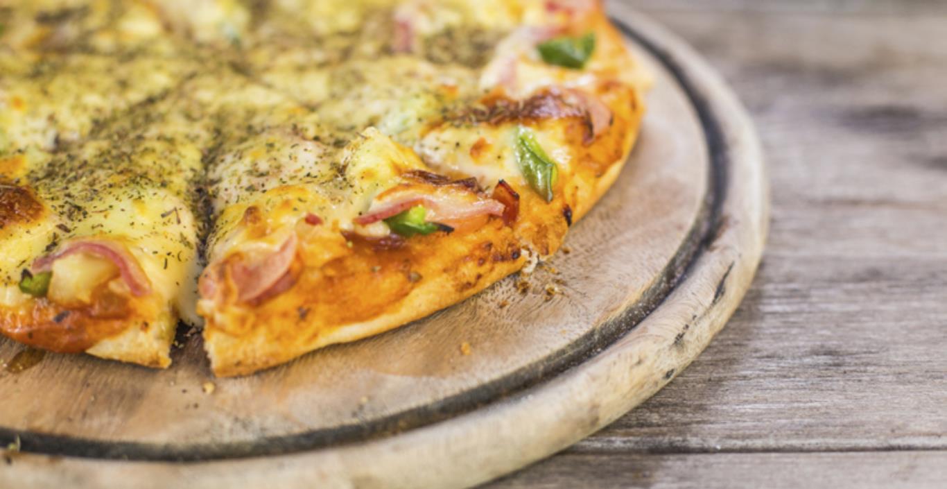 1 pâte à pizza légère faite maison ou non, 1 petite boîte de coulis de tomates, 2 tranches de jambon découenné et dégraissé, 1 boule de mozzarella, 1 boîte d’ananas en tranches, de l’origan, sel, poivre.