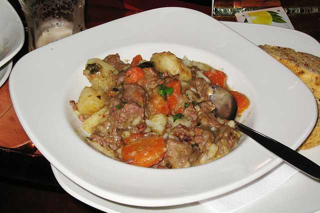 Mettre la viande dans une marmite avec les oignons, l'ail, le bouquet garni, sel, poivre et 2 pommes de terre coupées en morceaux. Mijoter 1 h 45. Ecraser les pommes de terre pour bien lier la sauce. Ajouter les pommes de terre et les oignons entiers. Cuire encore 1 h. Pour servir parsemer de persil haché. On peut ajouter des carottes en même temps que les pommes de terre ou lier sauce avec de la crème .