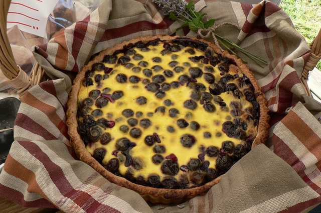 Pour 6 personnes. Pâte sablée: 1 oeuf, 100 g de sucre, 250 g de farine, 125 g de beurre, 1/2 c à café de cannelle, 1/2 c à café de sel. Crème: 2 oeufs entiers, 100 g de sucre, 125 g de crème fraîche, 500 g de myrtilles, 50 à 100 g de sucre suivant l'acidité des fruits.