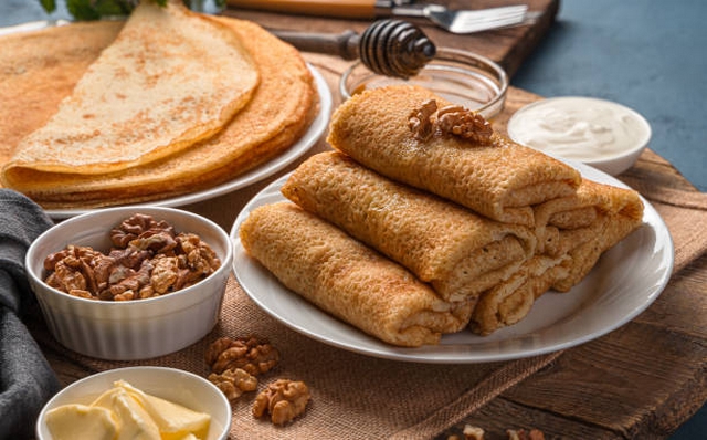 Préparez la pâte de la manière habituelle et laissez-la reposer 1 h. D'autre part, mélangez les noix, le sucre, le beurre ramolli et le lait, ajoutez les raisins gonflés dans le rhum et le zeste d'orange. Confectionnez les crêpes, tartinez-les de cette farce et roulez-les. Servez bien chaud, nappé à volonté de sauce au chocolat.