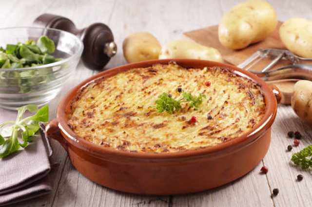 Hacher 500 g de viande de pot-au-feu, ajouter 2 jaunes d'oeufs, 10 cl de crème, 1 petit oignon, 1 gousse d'ail, 1 poignée de persil, de la gelée du bouillon, sel, poivre, 60 g de gruyère râpé. Mettre la viande entre deux couches de purée. Faire gratiner au four.