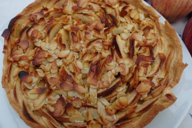 Pour 6 personnes. Préparation 20 mn. Cuisson 40 mn. 300 g de pâte brisée. Garniture: 750 g de pommes (reinette, boskoop), 50 g de beurre, 2 c à soupe de sucre en poudre, 1/2 c à café de cannelle. Crème: 2 oeufs entiers, 50 g de crème fraîche, 30 g de sucre en poudre, 1 c à soupe de calvados, une poignée d'amandes effilées.